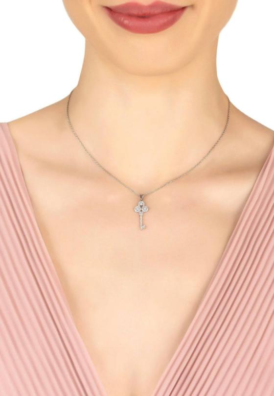 Design: Let the key pendant necklace be your new wardrobe staple. Ideal for those who adore jewellery with sparkle that can be worn for a chic daytime look through to evening elegance. At its heart, a key is an opener of locks. Whether it’s a door, a treasure chest, or the metaphorical heart, keys let us into unknown worlds. Keys symbolise freedom, they open things up and lock precious things away. They reveal secrets. The key motif is adorned with white zirconia around the bow and along the shank, suspended on a fine chain from a metallic bail. This pretty necklace would make an ideal gift for that someone special in your life, a coming of age gift or as a thank you for a bridesmaid or maid of honour. Finishing details include a lobster clasp, and size adjuster for ease of wear. Materials: 925 sterling silver. AAA white Cubic Zirconia. Style Notes: Bridal jewellery. Special occasion wear. Simple everyday styling. Ideal gift Dimensions: Length 40cm + 5cm size adjuster. Key length: 2.3cm width: 1cm. Packaging: This item is presented in Latelita London signature packaging Care Instructions: To maintain your jewellery, wipe gently with a damp cloth that is soft and clean. Do not soak in water. Avoid contact with soaps, detergents, perfume or hair spray.