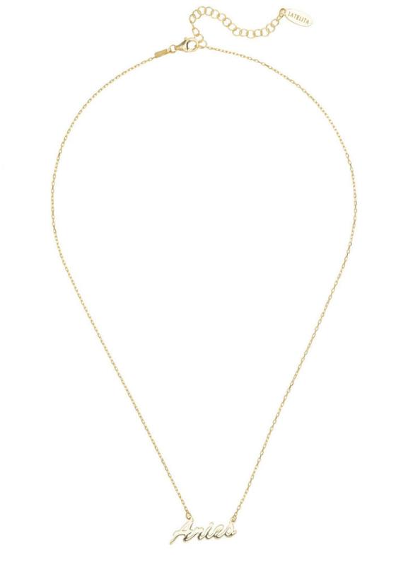 Design: Give your neckline something to boast about with this beautifully crafted zodiac star sign name necklace. This pretty necklace looks perfect worn alone or, create your own unique style by layering with other necklaces. Pretty and petite, this on trend script birth sign necklace is perfect for those who adore metallic jewellery.Aries celebrate birthdays March 21 – April 19, making this an ideal personalised birthday gift. Materials: 925 sterling silver dipped in 22ct Gold. Finished with a lobster clasp, and size adjuster. Style Notes: Birthday gift ideas. Simple everyday styling. Ideal giftAries March 21 – April 19. Dimensions: Necklace length 40cm with 5cm adjuster to wear long or short. Packaging: This item is presented in a Latelita London jewellery box. Care Instructions: To maintain your jewellery, wipe gently with a damp cloth that is soft and clean. Do not soak in water. Avoid contact with soaps, detergents, perfume or hair spray.